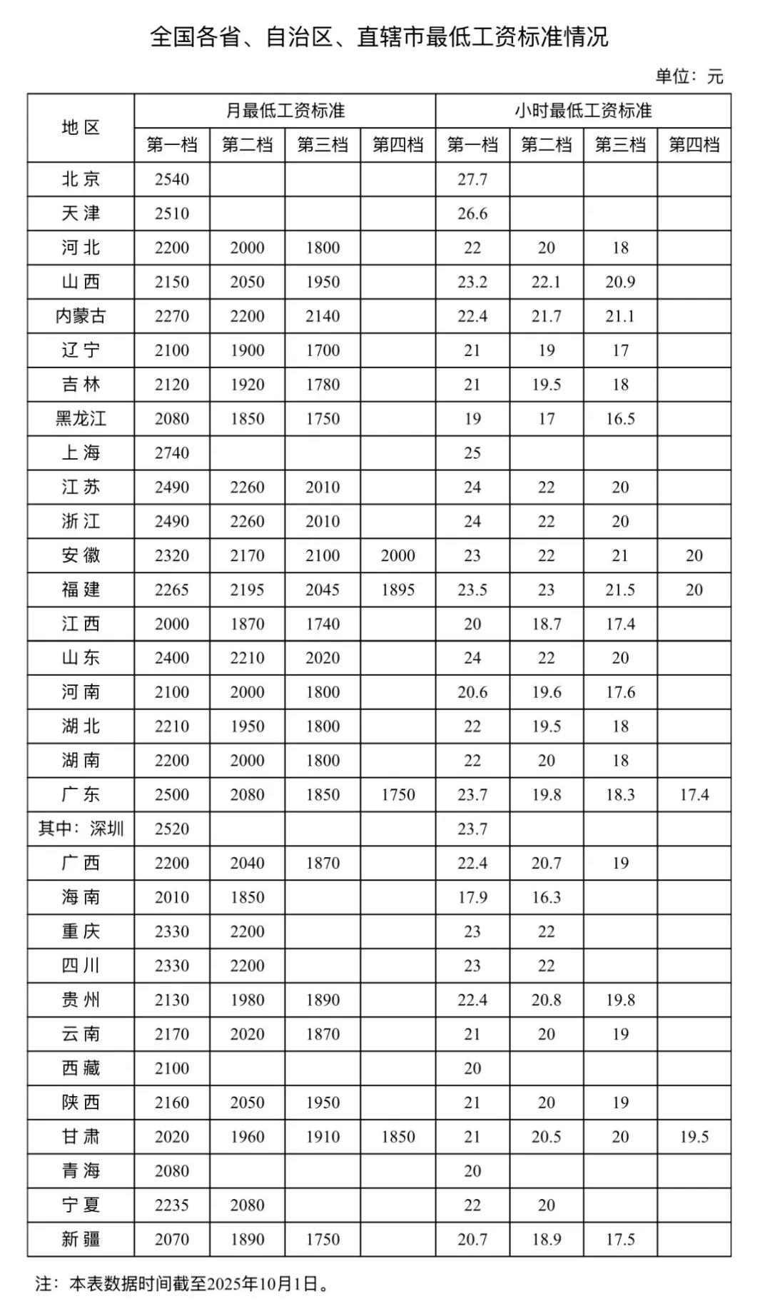最新!各地最低工资标准公布 来源:本网原创 作者:张治儒 时间:2025-11-06 访问次数:79 人力资源和社会保障部7月15日发布了全国各省、自治区、直辖市最低工资标准情况(截至2025年7月1日)。其中,上海月最低工资 标准2740元,为全国最高。北京小时最低工资标准26.4元,排名居首。 来源:人力资源和社会保障部网站